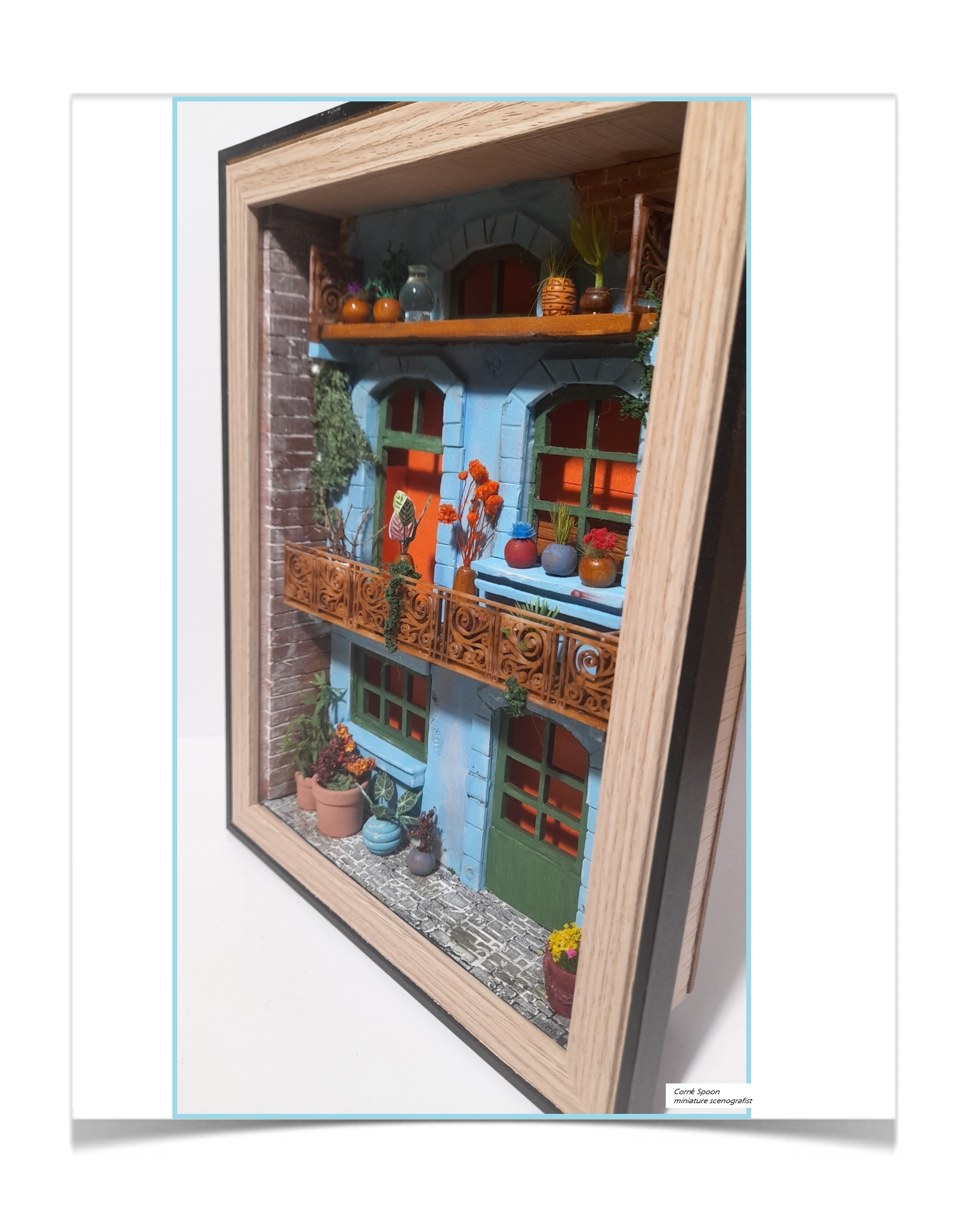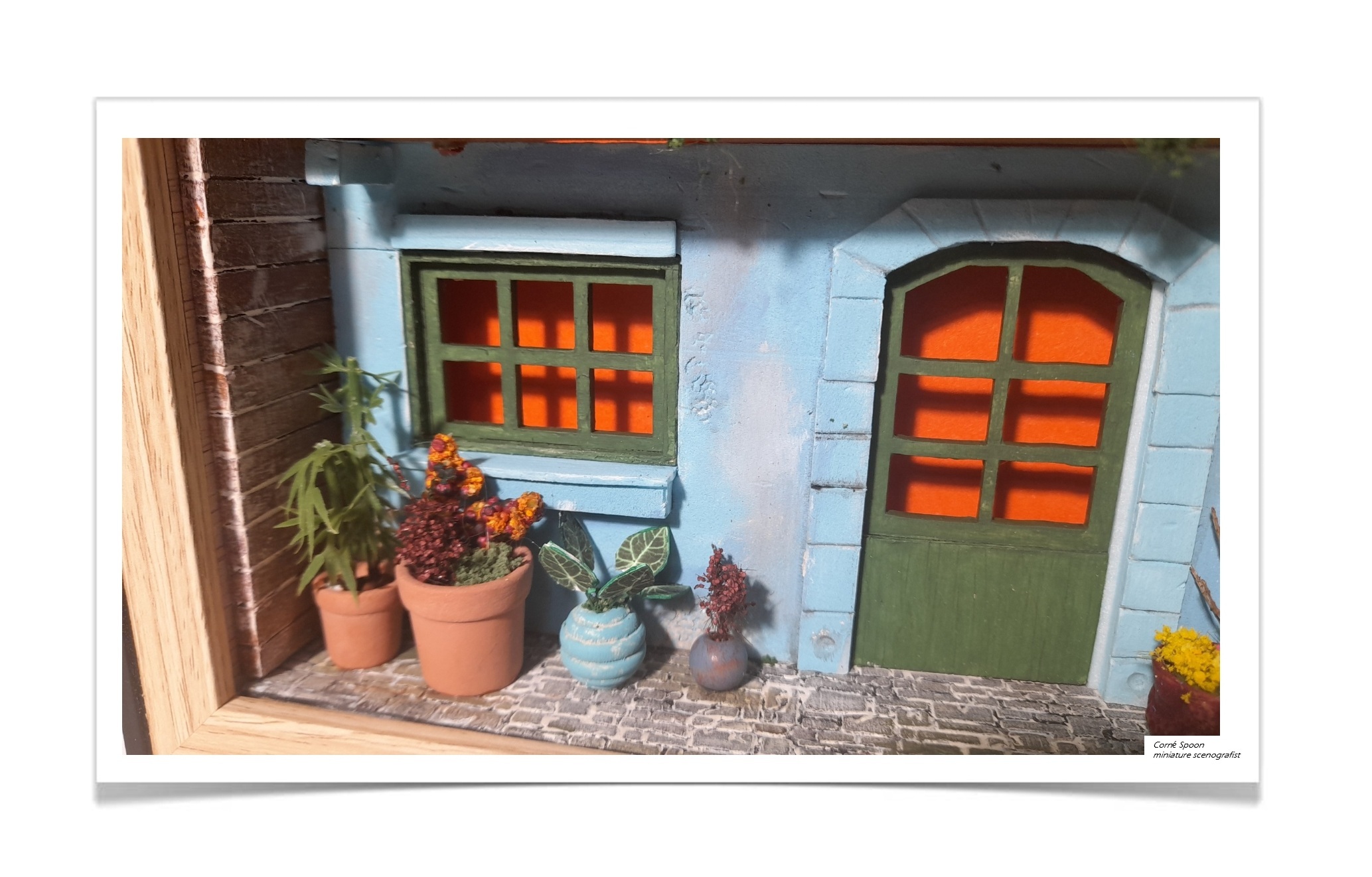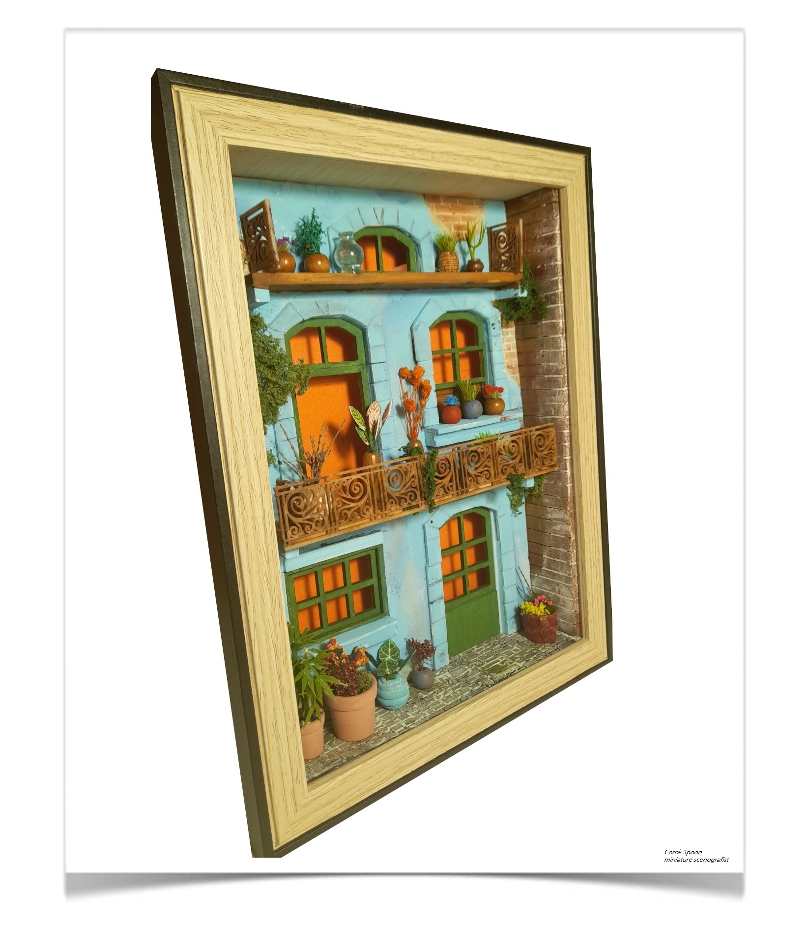 Deze miniatuur toont een levendige, kleurrijke gevel die meteen doet denken aan een warm, zuidelijk straatje. De blauwe muur vormt een opvallende achtergrond voor de groene en oranje accenten rond ramen en deuren. De sierlijke balkonrand, de boogvormige kozijnen en de vele potplanten geven het geheel een speelse, bijna mediterrane uitstraling. Boven hangen kleine potjes en kruiken, beneden loopt een geplaveid straatje langs de gevel.