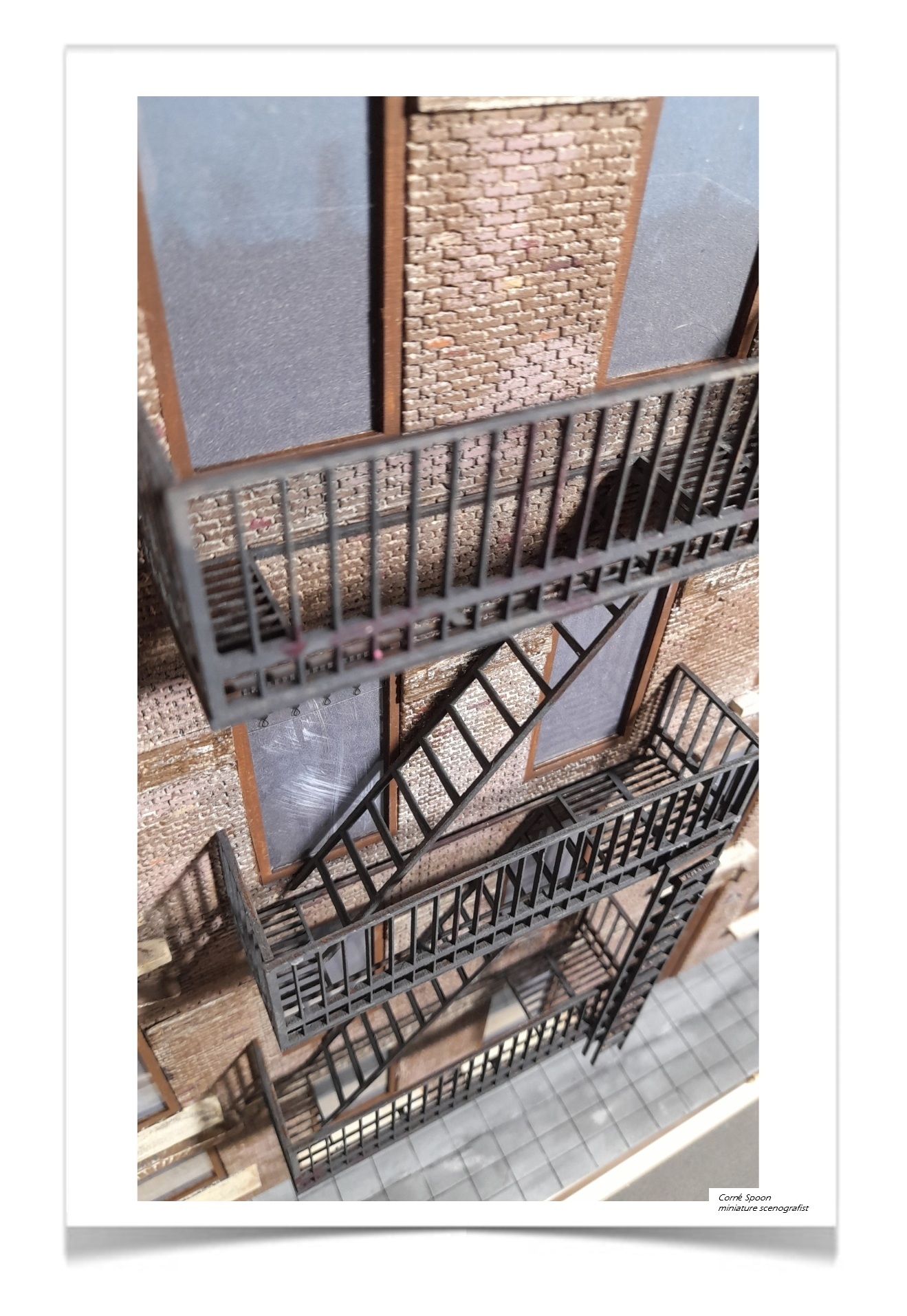 Deze miniatuur vangt de sfeer van een typisch stedelijk appartementengebouw met zijn kenmerkende brandtrappen. De gevel is opgebouwd uit realistisch metselwerk, met bogen boven de ramen en drie niveaus aan metalen balkons en ladders die direct doen denken aan New Yorkse straten. De matte ramen, het airco‑kastje en de eenvoudige toegangsdeur versterken het gevoel van een drukke, wat verweerde stadsomgeving. De stoep aan de voet van het gebouw maakt het tafereel compleet. Het geheel straalt vakmanschap uit en vertelt in één oogopslag het verhaal van een levendige, compacte stad.