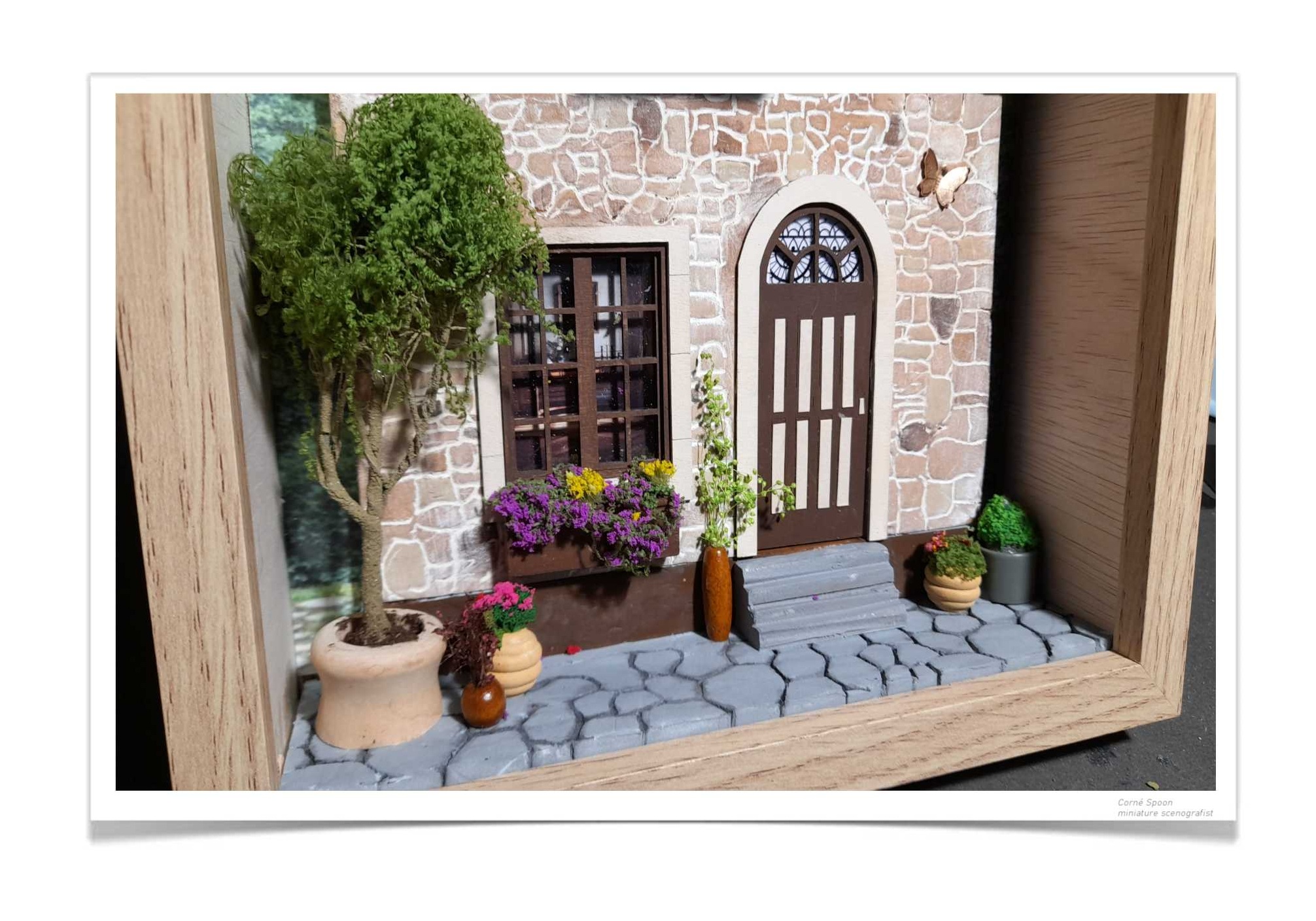 Deze miniatuur straalt de sfeer uit van een knus stenen huisje met een puntdak en een gevel vol textuur. De houten deur met witte panelen en het raam ernaast vormen een warm, uitnodigend middelpunt. Boven hangen bloembakken vol kleur, terwijl beneden potplanten en een klein boompje het tafereel tot leven brengen. Het geheel voelt als een rustig plekje aan de bosrand, waar tijd zachtjes voorbijgaat en elk detail met zorg is aangebracht.