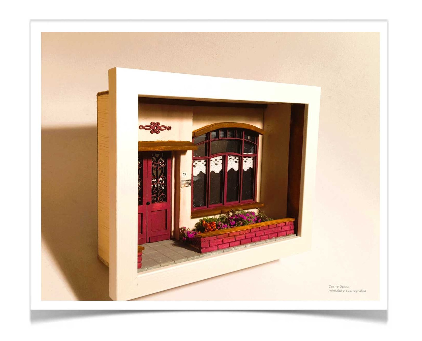 Deze miniatuur toont een elegante gevel met paarsrode dubbele deuren vol sierlijk metaalwerk en een groot raam met kantgordijnen. Onder het raam staat een bloemenbak vol paarse bloemen die het geheel een speels accent geven. De lichte muur met houten en paarse accenten geeft de scène warmte en rust. Het huisnummer en het subtiele bordje naast de deur maken het beeld compleet, alsof dit de ingang is van een klein verhaal dat zich net buiten beeld afspeelt.